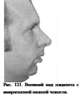 Так, при задержке роста, дистальном положении или деформации нижней челюсти (уменьшение угла) отмечается западение нижней губы, скошенность подбородка, заднее положение нижней челюсти. В то же время верхняя и средняя треть профиля лица и верхняя губа не изменены. В этих случаях при выдвижении нижней челюсти профиль лица нормализуется.