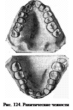 По Н.И. Агапову, рахитическая нижняя челюсть характеризуется трапециевидной формой альвеолярной дуги (рис. 124).