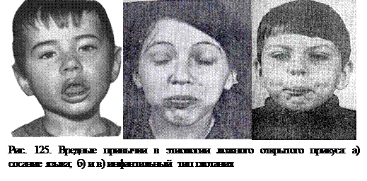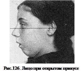 Клиника открытого прикуса. Зубоальвеолярная форма открытого травматического прикуса развивается в основном вследствие вредных привычек, о которых говорилось выше. Промежуток между зубами обычно соответствует форме предмета, который сосет ребенок. При резко выраженном открытом прикусе, когда между фронтальными зубами образуется значительное расстояние (0,5÷1,0см и больше), внешне определяется типичное нарушение соотношений между отдельными частями лица. Нижний отдел лица обычно чрезмерно велик по отношению к верхнему отделу (рис. 126).