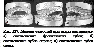 Открытый прикус нередко сопровождается зубоальвеолярным удлинением в боковых участках верхней челюсти и увеличением нижнечелюстных углов. Анализ диагностических моделей челюстей при открытом прикусе показывает, что зубные ряды верхней и нижней челюстей, как правило, деформированы при недостаточном развитии их апикальных базисов.