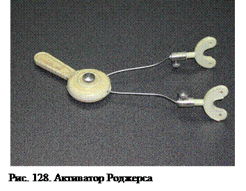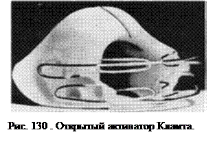 Открытый активатор Кламта (рис.130) представляет собой единый базис для верхней и нижней челюсти. В переднем отделе он открыт, но воздействию языка на фронтальные зубы препятствуют четыре V – образных отростка, вваренных в базис. Аппарат снабжен двумя дугами: вестибулярной, перемещающей нижние фронталь-ные зубы дистально, и оральной, перемещающей верхние фронталь-ные зубы мезиально. Активатор может быть распилен по сагиттали для расширения челюстей.