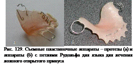 В период временного прикуса применяются разнообразные съемные аппараты с добавлением в их конструкцию элементов из проволоки или пластмассы, отстраняющих кончик языка от зубных рядов и препятствующих вредной привычке давления языком на передние зубы (открытый активатор Кламта, бионатор Бальтерса), а также активатор Андрезена—Гойпля, пропульсор Мюлемана и др. Конструкции этих аппаратов зависят от сопутствующей сагиттальной и трансверзальной патологии окклюзии.