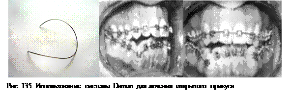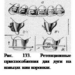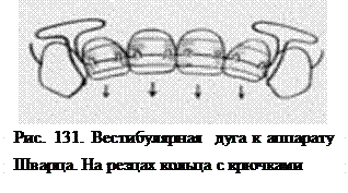 В конце периода сменного прикуса и в постоянном прикусе применяются несъемные дуговые аппараты, при достаточно устойчивых зубах возможно применение реверсионных дуг (рис. 135).
