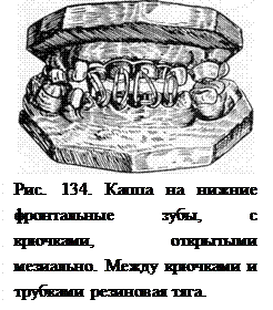 Если перемещению подлежат верхние и нижние передние зубы, применяют две дуги Энгля, на которых имеются соответствующее количество крючков, а межчелюстное вытяжение осуществляется при помощи резиновой тяги. Межчелюстное вытяжение можно провести также следующим образом. Верхние и нижние передние зубы покрывают каппами из пластмассы, штампованными из металла коронками или надевают на зубы спаянные кольца – при этом освобождают все режущие края, на которых имеются крючки для резиновой тяги соответственно количеству перемещаемых зубов.