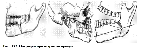 До операции заготавливают и укрепляют на зубах аппарат с межчелюстной тягой. Аппарат таков: накладывают коронки на вторые и третьи моляры и устанавливают кольца с крючками на группы фронтальных зубов обеих челюстей. После операции на крючки устанавливают резиновую тягу. Под влиянием резиновой тяги происходит медленный изгиб челюсти по местам, где удалены зубы и произведена декортикация (рис. 137, а). Указанная операция производится интраоральным путем. Если открытый прикус образовался в результате недоразвития фронтального отдела верхней челюсти, то устранение его можно достичь операцией, показанной на рис. 137, б. Устранение открытого прикуса можно получить и рассечением ветви нижней челюсти (рис. 137, в).
