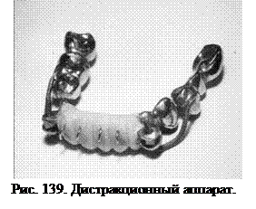 В течение догоспитального периода больного обследуют амбулаторно. Снимают оттиски с верхней и нижней челюстей, отливают модели (рабочие и контрольные). По рабочим моделям изготавливаютортодонтическое устройство (рис. 16). Дистракционный аппарат состоит из двух металлических капп, в боковых участках на контактируемые зубы с вестибулярной стороны припаивают резьбовые стержни, загнутые в переднем участке вертикально вверх справа и слева у края фронтальной каппы, и соединенные жестко с помощью винтовых пар с передней металлопластмассовой каппой на зубах, имеющих вертикальную щель (рис. 139). В том случае, если перемещение фрагмента тела нижней челюсти вверх больше 1см, то в первые 5-7 дней вертикальную дистракцию дополняют межчелюстной резиновой тягой.