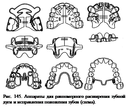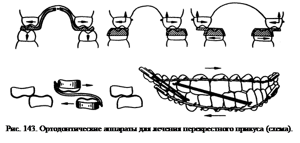 При лечении двустороннего вестибулярного перекрестного прикуса готовят устройство для верхней челюсти с двумя боковыми вестибулярными назубными дугами, располагаемыми в области премоляров и моляров нижней челюсти. Если показано одностороннее сужение верхнего или нижнего зубного ряда, то готовят одну боковую вестибулярную назубную дугу на стороне нарушенного прикуса и окклюзионные накладки из пластмассы на противоположной стороне в области боковых зубов верхней и нижней челюстей.