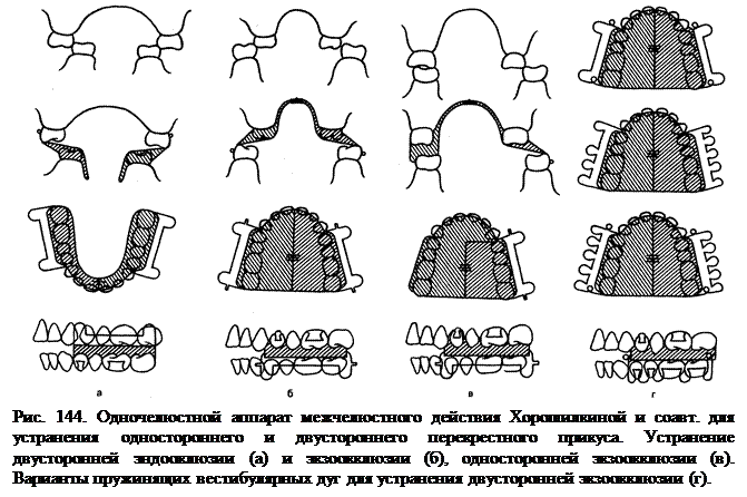 Устройство для лечения перекрестного прикуса, предложенное Ф.Я.Хорошилкиной, Ю.К. Петровой, Л.В. Сериковой и Э.А. Вольским, состоит из базиса, выполненного из пластмассы, кламмеров, фиксирующих базис на зубах, двух окклюзионных накладок на боковые зубы, выполненных в виде наклонных плоскостей для зубов противоположной челюсти и вестибулярных назубных дуг (из ортодонтической проволоки диаметром 0,8 – 1 мм), опирающихся на боковые зубы противоположной челюсти. При показаниях к сужению зубного ряда одной челюсти и одновременному расширению противоположной в базис вводят расширяющий винт. Для изготовления такого устройства предварительно определяют конструктивный прикус и разобщают зубные ряды до устранения контактов между боковыми зубами.