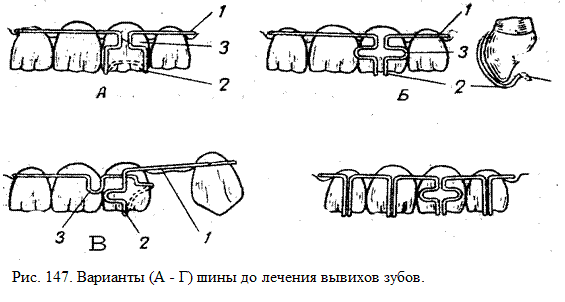 В зависимости от смещения зуба шина имеет следующие основные варианты: для перемещения в вертикальном направлении, при этом она опирается на углы коронки (рис. 147, А); для перемещения в вертикальном и вестибулооральном направлении (рис. 147, Б); для перемещения в вертикальном и мезиодистальном направлении (рис. 147, В). Перемещение в вестибулярном направлении осуществляется накусыванием на окклюзионную накладку, которая служит продолжением фиксирующей части, для перемещения в оральном направлении изготавливается крючок. Если необходимо вывести поврежденный зуб из прикуса, на соседние зубы делают петли с окклюзионными накладками (рис. 147, Г). Определенные трудностями возникают при накладывании шин у детей с глубоким и перекрестным прикусом. В этих случаях необходимо, чтобы фиксирующая зуб часть (2) едва перекрывала его режущий край.