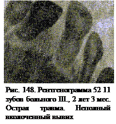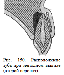 Возможны два варианта неполного вывиха зуба. В первом случае зуб не полностью утрачивает связь с лункой, но выдвигается по вертикали в положение супраокклюзии (рис. 149).