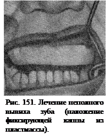 При неполном вывихе после рентгенологического исследования и установления целости корня под местным инфильтрационным обезболиванием производят пальцевое вправление зуба и фиксируют его с помощью лигатур, шины - скобы или каппы из пластмассы (рис. 151).