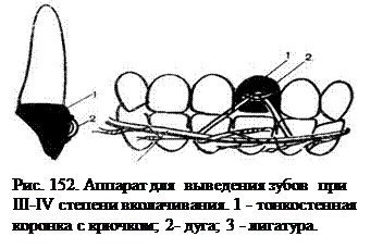 При III, IV и V степени укорочения коронки зуба необходимо использовать конструкции, изготовленные лабораторным способом. Аппараты, применяемые с этой целью, могут быть съемными и несъемными, одно- и двухчелюстными, пластмассовыми и металлическими. В качестве лигатур можно использовать хлопчатобумажные нити или проволочную лигатуру (рис. 152).