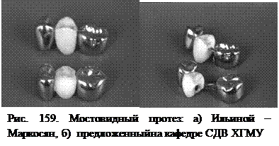 При восстановлении дефектов зубного ряда у детей мостовидными протезами с односторонней опорой (консольные). Неотъемлемой частью детского консольного мостовидного протеза является литая окклюзионная накладка или отросток на оральной поверхности передних зубов, отходящий от тела протеза к зубу непокрытому опорной коронкой. Он предохраняет недостаточно устойчивый опорный зуб от вывихивающих и вращательных движений под давлением языка, откусывания и пережевывания пищи. Окклюзионная накладка располагается в фиссуре на интактной поверхности эмали, а при наличии в зубе кариозной полости изготавливается вкладка с углублением для нее. При протезировании данной конструкцией мостовидного протеза необходимо осуществлять постоянный контроль за тем, чтобы во время роста челюсти окклюзионная накладка не сошла с опорного зуба, если же из наблюдений этот фактор становится явно неизбежным, протез необходимо заменить.