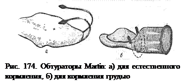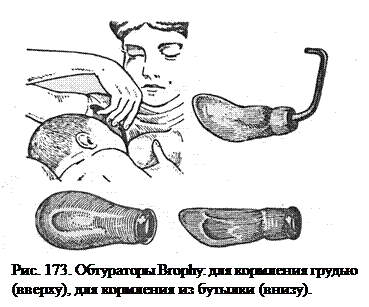 В 1923 г. Brophy предложил для грудных детей два обтуратора. Первый - для естественного кормления - представляет пластинку мягкой резины, укрепленной на алюминиевой ручке. На время кормления мать вводит обтуратор в рот ребенка и удерживает его за ручку. Второй - для искусственного кормления - сделан в виде соски, которую сверху перекрывает вогнутая резиновая пластинка. Соску надевают на бутылочку с молоком и вводят в рот ребенку, так чтобы пластинка полностью закрывала щель в небе и давала возможность спокойно сосать и глотать.