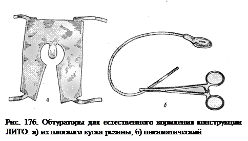 В 1949 - 1950 гг. в ЛИТО предложены для кормления грудью два обтуратора. Один представляет собой четырехугольный лист мягкой резины, выкроенный (см. рис.). Его укрепляют на груди матери так, что резиновый клапан располагается непосредственно над соском. Клапан создает разобщение ротовой и носовой полостей при сосании. Другой обтуратор - пневматический. Для его изготовления используют палец хирургической перчатки и посредством липкого пластыря соединяют с тонким резиновым катетером. Перед кормлением баллон вводится в полость рта, слегка надувают и перекрывают катетер зажимом, затем дают грудь. После кормления снимают зажим с катетера и, выпустив воздух из баллона, выводят его из полости рта.