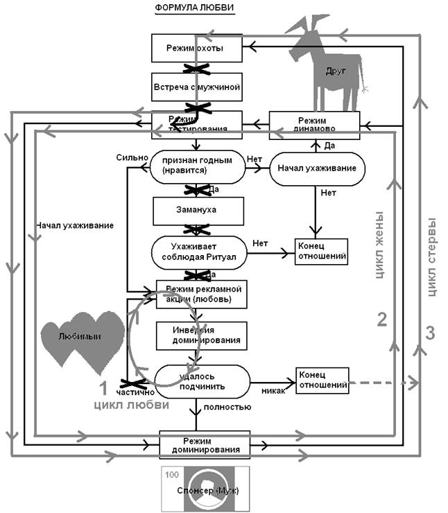 Рис. 47. Формирование феминизмом неадекватного восприятия противоположного пола и неадекватных отношений. Женщина воспринимает мужчину как источник дохода, а мужчина не видит опасности.