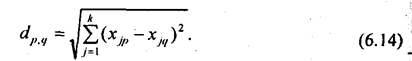 В многомерном признаковом пространстве расстояние между точками р и q с k координатами, т. е. индивидуальными значениями k признаков, определяется так: