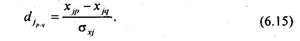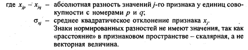 Совершенно очевидно, что нельзя суммировать квадраты отклонений одной точки от другой в абсолютных значениях разнокачествен-ных признаков. Необходимо сначала выразить различия между единицами совокупности по каждому признаку в каком-то относитель,но безразмерном показателе. В качестве такого показателя часто применяют «нормированную разность», т. е. величину: