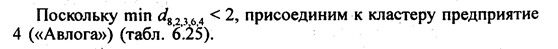 Сравнивая табл. 6.24 и 6.25, видим, что расстояния между кластером и объектом 1 и в обоих случаях определяются объектом 6, который является «ближайшим соседом» объекта 1. При определении расстояния между кластером и предприятием 7 представителем кластера выступает предприятие 6, которое является ближайшим к предприятию 7.