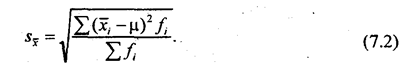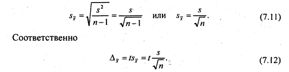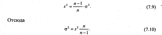 Чтобы вычислить ошибку выборки при принятой доверительной вероятности, нужно рассчитать величину средней ошибки sx. Формула для ее определения (7,4) включает дисперсию признака в генеральной совокупности σ2, которая, как правило, неизвестна. Может быть определена только выборочная дисперсия s2. Доказано, что соотношение между σ2 и s2 определяется следующим равенством: