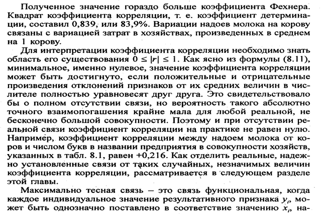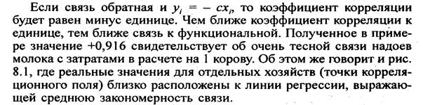Он означает, что в среднем по изучаемой совокупности отклонение затрат на 1 корову от средней величины на 1 руб. приводило к отклонению с тем же знаком среднего надоя молока на 0,0347 ц, т. е. на 3,47 кг на корову. При нестрогой интерпретации говорят: «С увеличением затрат на корову на 1 руб. в среднем надой молока возрастал на 3,47 кг». Поскольку и до начала резкой инфляции стоимость 3,47 кг молока значительно превосходила рубль, увеличение затрат на корову было экономически целесообразным.