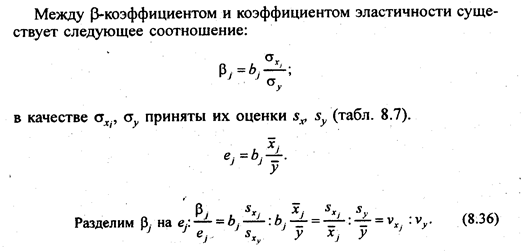 Итак, мы получили, что β-коэффициент фактора хj относится к коэффициенту эластичности этого фактора, как коэффициент вариации фактора к коэффициенту вариации результативного признака. Поскольку, как видно по последней строке табл. 8.7, коэффициенты вариации всех факторов меньше коэффициента вариации результативного признака; все β-коэффициенты меньше коэффициентов эластичности.