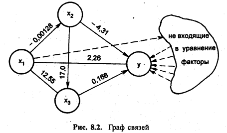 Условно-чистый коэффициент регрессии при x1, составляет только 58% парного. Остальные 42% связаны с тем, что вариации x1 сопутствует вариация факторов x2 x3, которая, в свою очередь, влияет на результативный признака. Связи всех признаков и их коэффициенты парных регрессий представлены на графе связей (рис. 8.2).