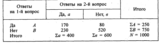 Если бы все, ответившие «да» на 1-й вопрос, отвечали бы «да» на 2-й вопрос, и так же совпадали ответы «нет», то связь была бы предельно тесной, функциональной. Но на самим деле распределение ответов на оба вопроса не совпадает. Большая часть ответивших «да» на 1-й вопрос ответила «да» и на 2-й вопрос, но часть ответила «нет». То же относится к ответившим «да» на 2-й вопрос. Связь есть, но неполная, типа корреляционной, и нужно измерить тесноту этой связи.