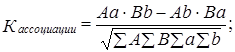 Свойства коэффициента ассоциации такие же, как и у коэффициента корреляции: коэффициент ассоциации обращается в нуль, если оба произведения в числителе точно уравновешиваются (что крайне маловероятно); он равен плюсединице, если отсутствуют оба гетерогенных сочетания Аb и Ba; равен минус единице, если отсутствуют гомогенные сочетания ответов Аа и Bb.