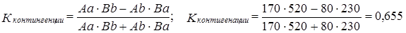 Другой метод измерения связи по «четырехклеточной таблице» предложен английскими статистиками Эдни Дж. Юлом (1871-1951) и Морисом Дж. Кендэлом (1907). Числитель этого коэффициента, называемого коэффициентам контингенции, совпадает с числителем коэффициента ассоциации Пирсона, а в знаменателе - сумма тех же произведений, разность которых стоит в числителе: