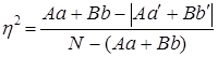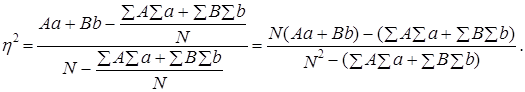 Предельно возможный избыток был бы в том случае, если бы не было гетерогенных сочетаний, т. е. Аb и Bа. Он составляет 140+80 + 230 = 450. Сам же показатель тесноты связи - отношение фактического излишка к предельному: 140: 450 =0,311. Как видим, этот показатель близок к коэффициенту ассоциации, но обладает чрезвычайно логичной и ясной интерпретацией: связь составляет 0,311 или 31,1%, от предельно возможной функциональной. Этот показатель - аналог не коэффициента корреляции, а коэффициента детерминации. Поэтому правомерно обозначить его как R2 или η2. Он имеет вид: