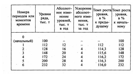 Показатель ускорения абсолютного изменения уровней выражается в единицах измерения уровня, деленных на квадрат длины периода. В нашем случае ускорение составило 4 тыс. т в год за год или 4 тыс. т год-2. Смысл показателя следующий: объем производства (или добычи угля, руды) имел абсолютный прирост, возрастающий на 4 тыс. т в год ежегодно.