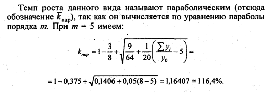 Расчет по этому среднегодовому темпу дает сумму выпуска за 5 лет в 8,069 раза больше базисной, т.е. приближение хорошее. В общем виде проблема параболических темпов исследована саратовским статистиком Л. С. Казинцом в книге «Темпы роста и абсолютные приросты» (М.: Статистика, 1975). Им составлены таблицы, с помощью которых, зная отношение суммы уровней к базисному уровню и число суммируемых уровней т, можно получить knap. Таблица Л. С. Казинца рассчитана на основе нахождения корней уравнения: