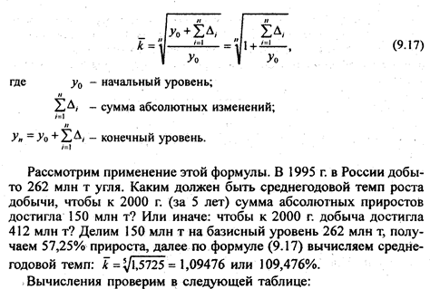 Если необходимо определить средний темп изменения, исходя из заданной на п периодов суммы абсолютных изменений, то следует использовать формулу (9.17):