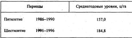 По данным табл. 9.1 определим среднегодовые уровни урожайности картофеля по пяти-шестилетиям: