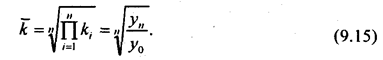 Средний темп изменения определяется наиболее точно при аналитическом выравнивании динамического ряда по экспоненте (см. п. 9.5 и 9.6). Если можно пренебречь колеблемостью, то средний темп определяют как геометрическую среднюю (см. гл. 5) из цепных темпов роста за п лет или из общего (базисного) темпа роста за п лет: