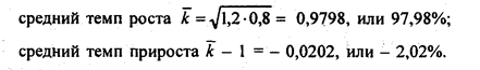 Если исходной информацией служат темпы прироста и нужно вычислить их среднегодовую величину, то предварительно следует все темпы прироста превратить в темпы роста, прибавив 1, или 100%, вычислить их среднюю геометрическую и снова вычесть 1, или 100%. Интересно, что ввиду асимметрии темпа прироста и темпа сокращения при равных их величинах общий темп прироста всегда отрицателен. Так, если за первый год объем производства вырос на 20%, а за второй снизился на 20% (темпы цепные), то за два года имеем: