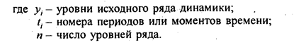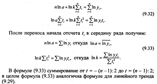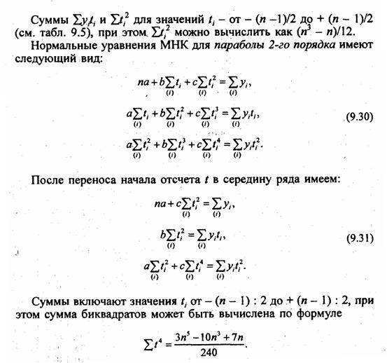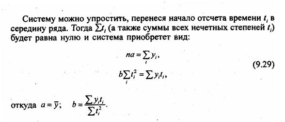 Когда тип тренда установлен, необходимо вычислить оптимальные значения параметров тренда исходя из фактических уровней. Для этого обычно используют метод наименьших квадратов (МНК). Его значение уже рассмотрено в предыдущих главах учебного пособия, в данном случае оптимизация состоит в минимизации суммы квадратов отклонений фактических уровней ряда от выравненных уровней (от тренда). Для каждого типа тренда МНК дает систему нормальных уравнений, решая которую вычисляют параметры тренда. Рассмотрим лишь три такие системы: для прямой, для параболы 2-го порядка и для экспоненты. Приемы определения параметров других типов тренда рассматриваются в специальной монографической литературе.