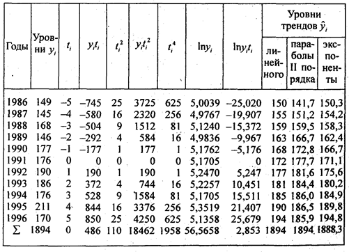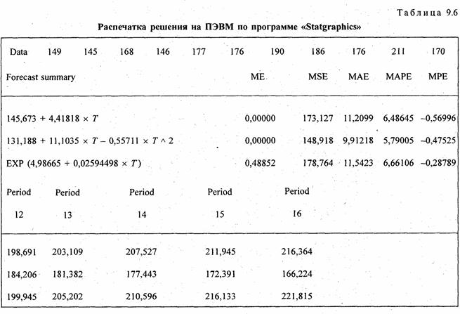 Рассчитанные по уравнениям трендов уровни записаны в трех последних графах табл. 9.5. Как видно по этим данным. расчетные значения уровней по всем трем видам трендов различаются ненамного, так как и ускорение параболы, и темп роста экспоненты невелики. Существенное отличие имеет парабола - рост уровней с 1995 г. прекращается, в то время как при линейном тренде уровни растут и далее, а при экспоненте их ост ускоряется. Поэтому для прогнозов на будущее эти три тренда неравноправны: при экстраполяции параболы на будущие годы уровни резко разойдутся с прямой и экспонентой, что видно из табл. 9.6. В этой таблицепредставлена распечатка решения на ПЭВМ по программе «Statgraphics» тех же трех трендов. Отличие их свободных членов от приведенных выше объясняется тем, что программа нумерует года не от середины, а от начала, так что свободные члены трендов относятся к 1986 г., для которого t = 0. Уравнение экспоненты на распечатке оставлено в логарифмированном виде. Прогноз сделан на 5 лет вперед, т.е. до 2001 г.. При изменении начала координат (отсчета времени) в уравнении параболы меняется и средний абсолютной прирост, параметр b. так как в результате отрицательного ускорения прирост все время сокращается, а его максимум - в начале периода. Константой параболы является только ускорение.