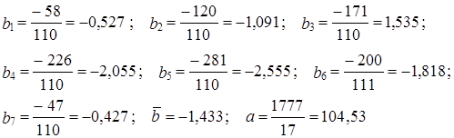 Согласно формуле (9.29) параметры линейного тренда равны а = 1894/11 = 172,2 ц/га; b = 486/110 = 4,418 ц/га. Уравнение линейного тренда имеет вид: