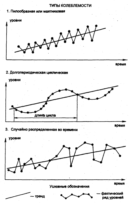 Типы колебаний статистических показателей весьма разнообразны, но все же можно выделить три основных: пилообразную или маятниковую колеблемость, циклическую долгопериодическую и случайно распределенную во времени колеблемость. Их свойства и отличия друг от друга хорошо видны при графическом изображении рис. 9.2.