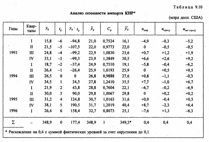 Наиболее точную и полную методику анализа с разложением ряда динамики на три компонента: тренд, сезонную колеблемость и случайную колеблемость рассмотрим на примере динамики импорта КНР по кварталам за 1993 - 1995 гг. (табл. 9.10).