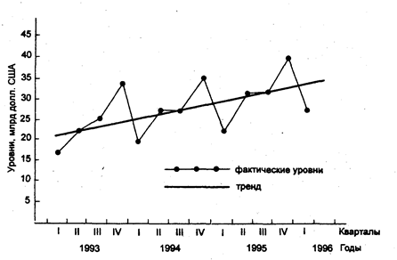 Прежде всего отметим, что при наличии существенных сезонных колебаний параметры тренда будут вычислены правильно только при условии, что первый и конечный уровни относятся к одному и тому же кварталу (месяцу), иначе сезонность исказит параметры тренда. Поэтому, в расчет включаем и I квартал 1996 г.