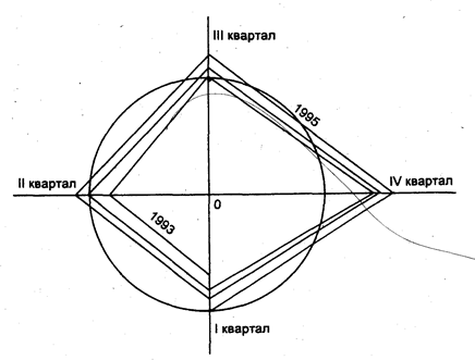 Второй способ - изображение в полярных координатах. Величина уровня изображается расстоянием от центра, между месяцами угол 30°, между кварталами - 90°. График имеет вид разворачивающейся спирали, если тренд направлен к возрастанию, и сворачивающейся, если тренд направлен к уменьшению уровней. Сезонные колебания выражены тем, что точки четвертых кварталов далеко выходят за окружность, радиус которой - средний уровень 1993 г., а точки первых кварталов - внутри нее (рис. 9.4).