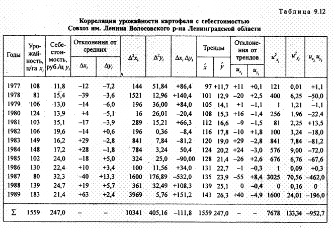 Характерным примером для иллюстрации особенностей методики анализа корреляции в рядах динамики служит связь динамики урожайности сельскохозяйственных культур с себестоимостью продукции в 70 - 80-е гг. в СССР. Официально тогда, не признавалось наличие инфляции. Однако, даже в тех хозяйствах, где агротехника прогрессировала и урожайность имела тенденцию роста, себестоимость продукции тоже возрастала. Такой пример представлен в табл.9.12.