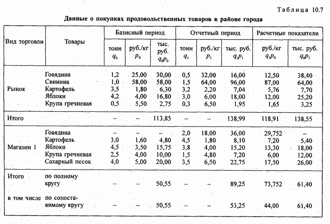 В нашем примере (табл. 10.7) были товары, не сопоставимые с позиций отдельных видов торговли, но в целом для торговли все они сопоставимы.