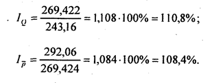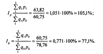 Использование средней базисной цены на говядину по всем видам торговли дает менее реальные результаты ввиду того, что значительный объем продаж говядины осуществляется на рынке, где цены были выше. Поэтому р ̅г > р ̅г0. Значение индекса объема продаж составило: