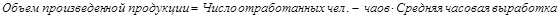 | Объем произведенной = продукции | Средняя списочная численность работников | Доля рабочих в средне-списочной численности работников | Среднее число дней работы | Средняя продолжительность рабочего дня | Средняя часовая выработка. |