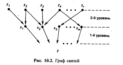 На рис. 10.2 изображен гипотетический граф связей, в котором элементы «высшего» уровня структуры обозначены как хj (j = 1,2,..., т). Это факторы, находящиеся в жесткой связи с результатом (у);. z1 - глубинные факторы, принадлежащие другому уровню изучаемой структуры связей (l = 1,2,...,г). Эти факторы находятся в стохастической связи с хj и у.