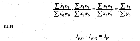 Остановимся подробнее на методике комплексного использования методов. Рассмотрим простейший случай. Пусть изучаемый результативный признак может быть представлен как жестко детерминированная двухфакторная мультипликативная функция у = xw (несмотря на то, что оба фактора х и w принадлежат одному и тому же уровню изучаемой структуры, мы обозначили их по-разному для того, чтобы облегчить изложение методических вопросов). Пусть х - первичный (объемный) признак, w - вторичный (так называемый количественный) признак. Тогда система аналитических индексов имеет вид: